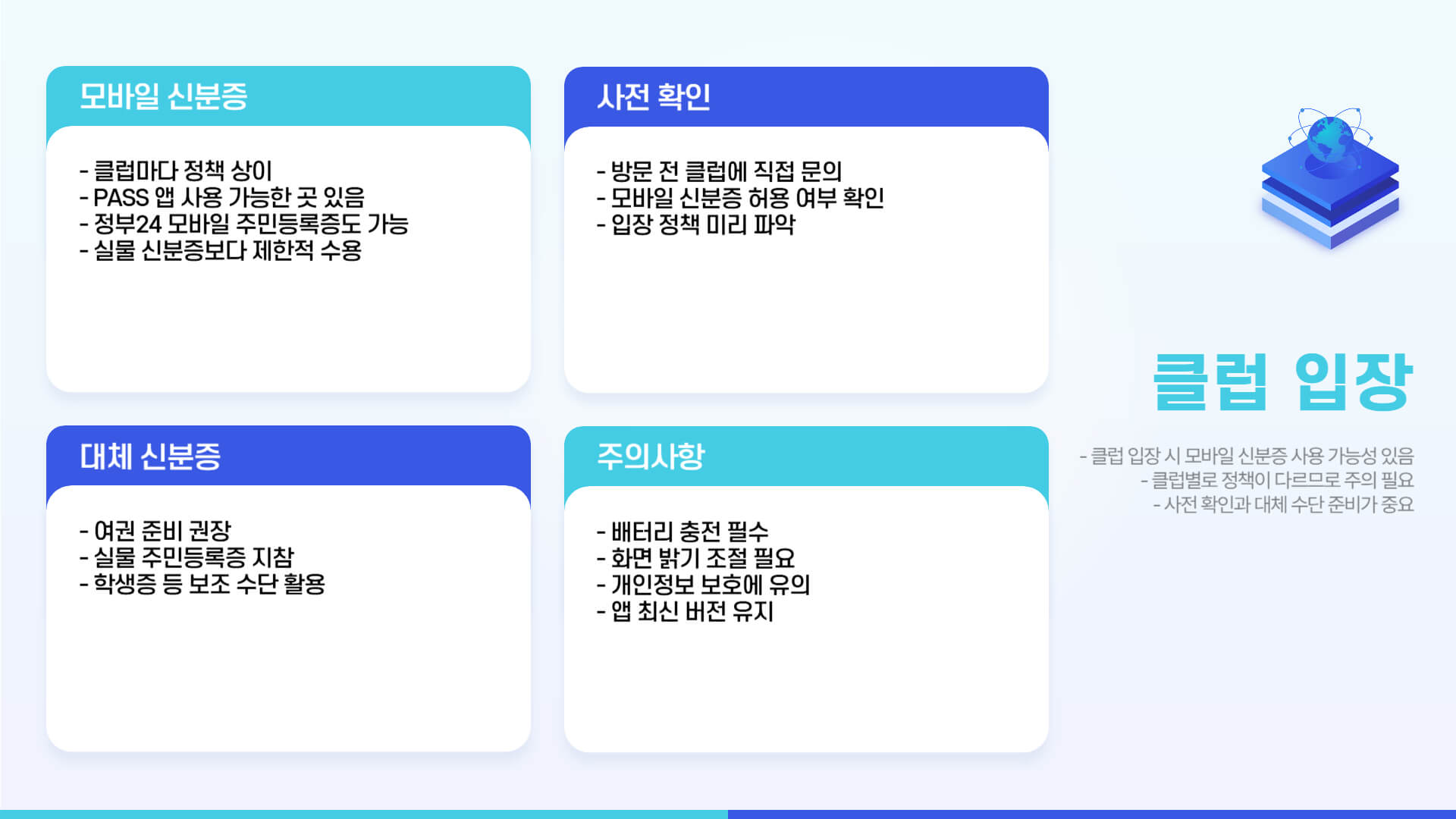 - 일부 클럽에서는 모바일 신분증을 허용하지 않을 수 있으니, 여권이나 다른 실물 신분증 준비가 가장 안전합니다.