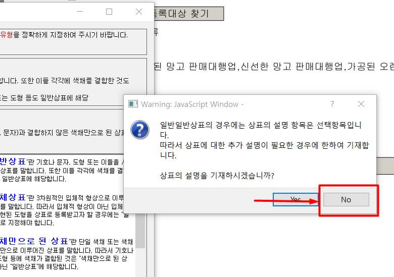 상표의 설명 기재를 NO로 체크 후 확인