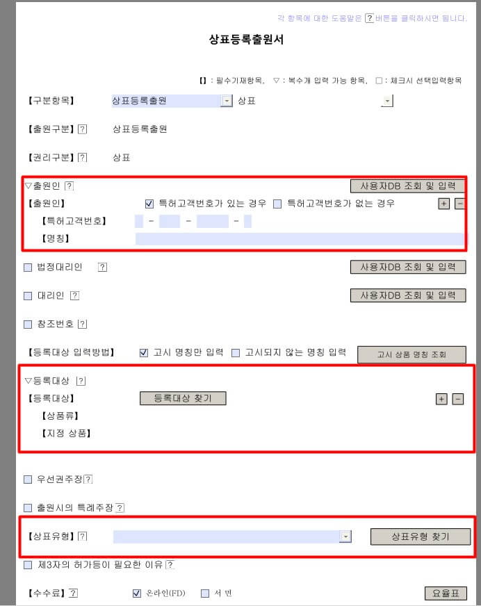 여기에서 [출원인] [등록대상] [상표유형]만 입력하면 됩니다.