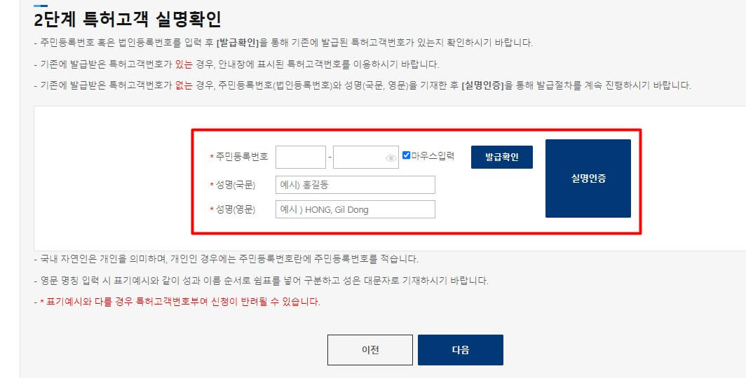 다음에는 특허고객 실명확인을 하게 되는데 작성하고 발급확인을 누르면 신규고객은 특허고객번호가 없다고 나오고 기존 상표권등록자는 고객번호가 나오게 되니 참고 하시면 되겠습니다. 신청후 대략 2~3일후 특허고객번호가 부여됩니다. 요즘은 신청자가 많아 일주일도 걸린다고 하니 참고하시면 되겠습니다.