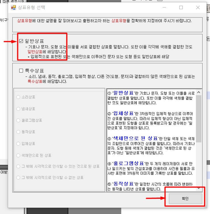 일반상표 체크후 확인 클릭