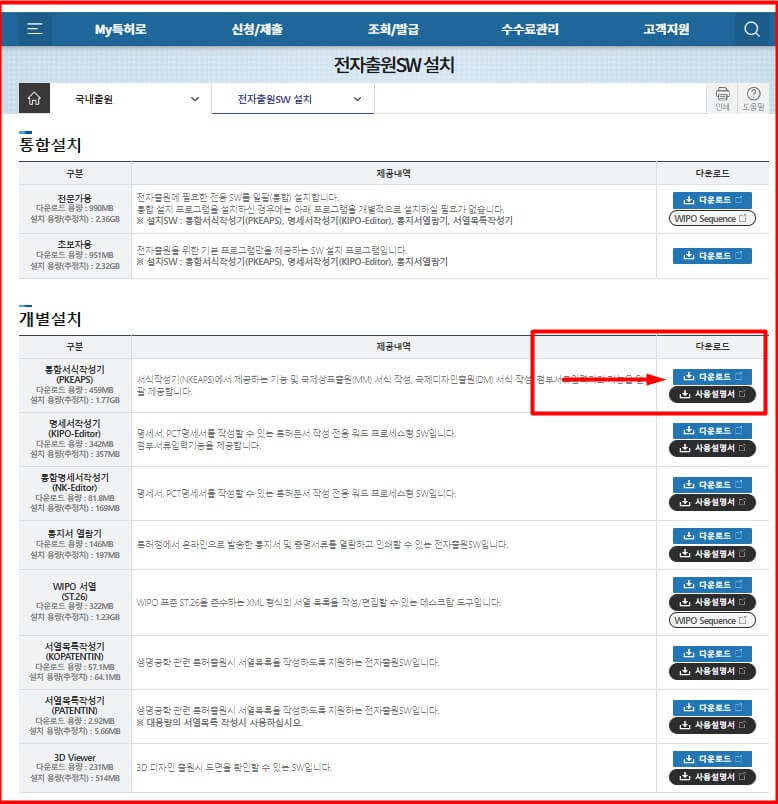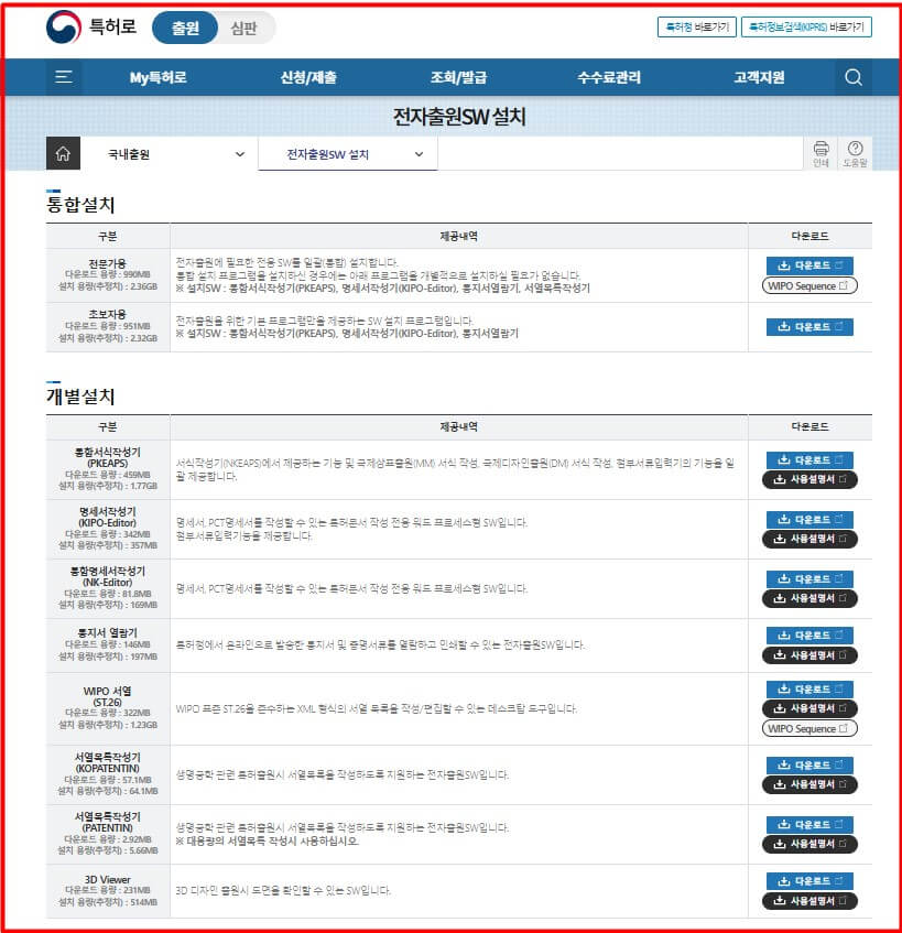 전자출원SW설치를 클릭하고 상표권 출원만 하면 되기에 개별설치에서