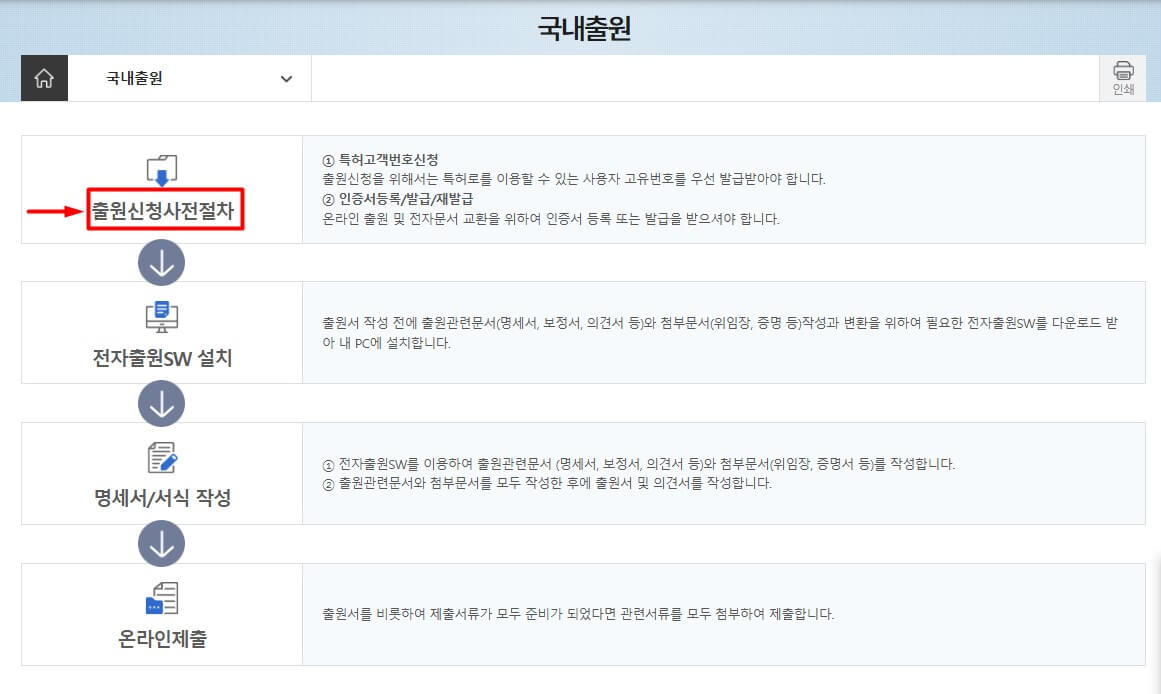 먼저 국내출원신청을 클릭하면 출원절차에 대한 내용이 나오는데