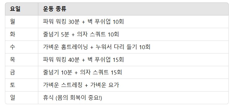 처음부터 너무 무리한 운동을 하면 몸이 지쳐서 포기하기 쉽습니다. 아래 루틴을 참고해서 천천히 시작해 보세요.