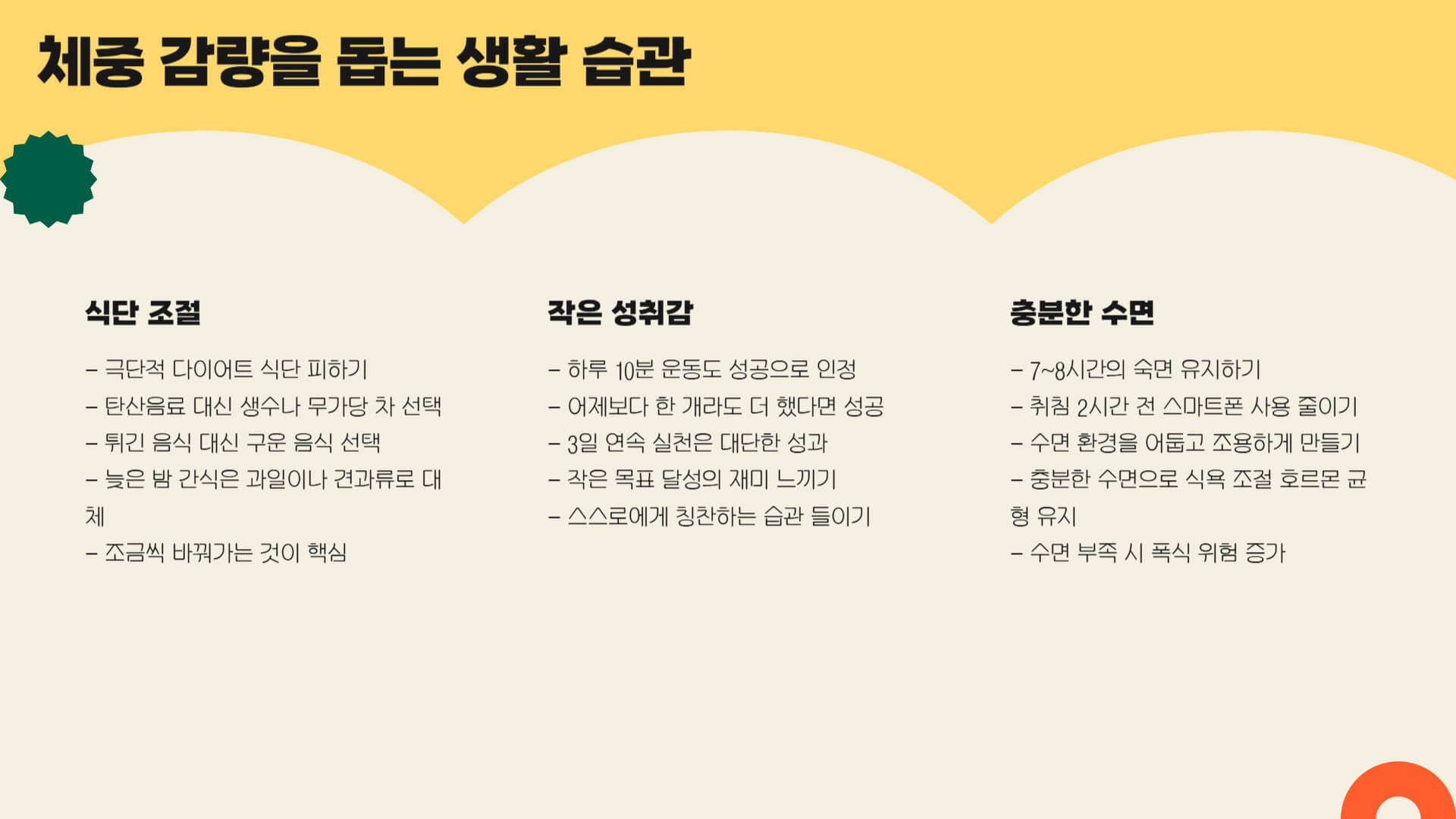 체중 감량은 하루아침에 이루어지는 것이 아닙니다. 하지만 작은 습관부터 바꾸면 몸이 서서히 변하는 것을 느낄 수 있습니다.