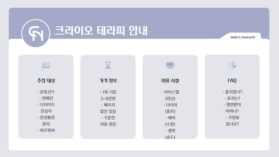 크라이오 테라피 위치 검색 팁: 구글에서 "크라이오 테라피 + 지역명"으로 검색하면 가장 가까운 센터를 쉽게 찾을 수 있습니다.