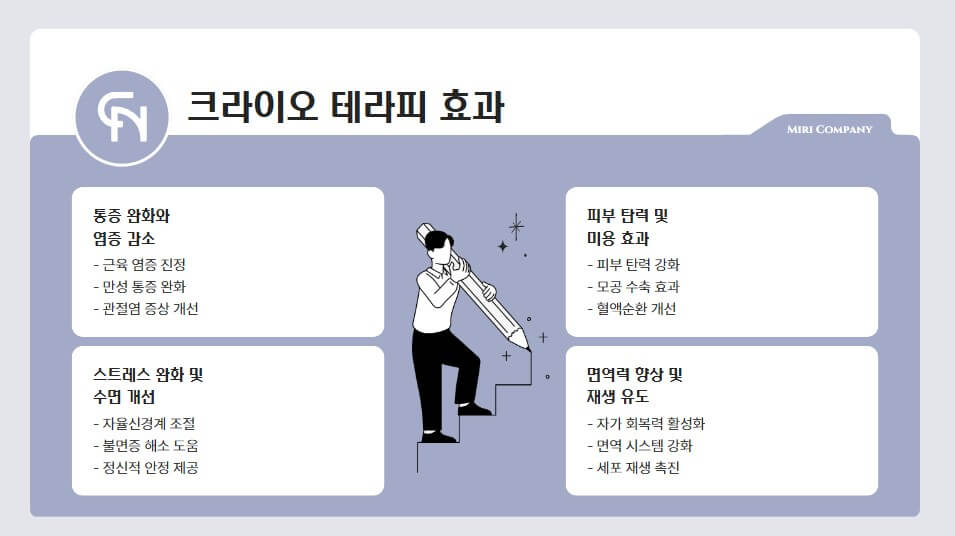 "전신 냉각 요법"은 근육의 염증을 빠르게 진정시켜 운동 후 회복에 도움을 줍니다. 특히 만성 통증이나 관절염 환자들에게 유의미한 효과가 있다는 연구 결과도 있습니다.