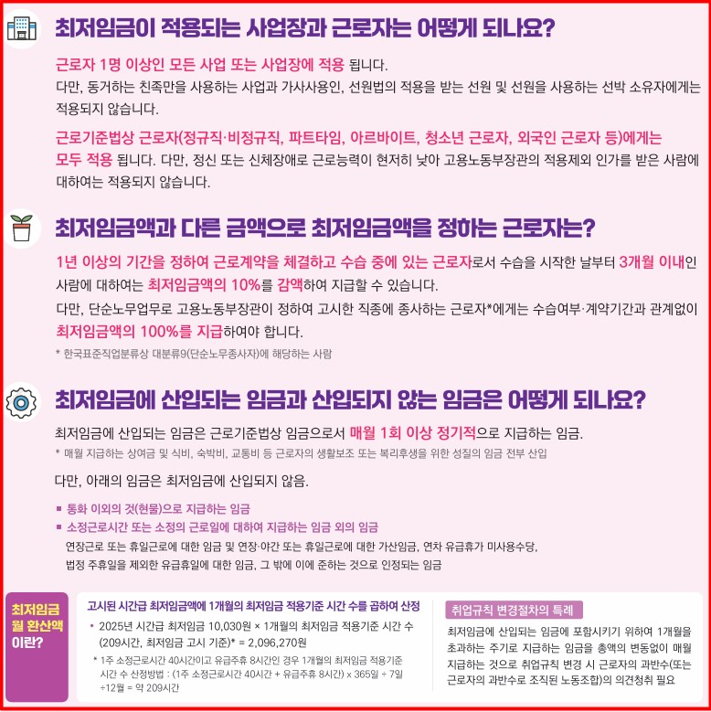 월 환산액: 2,096,270원 (209시간 기준) 전년 대비 1.7% 인상 (170원 상승) 최저임금은 근로자가 1명 이상인 모든 사업장에 적용되며, 정규직, 비정규직, 아르바이트 등 모든 근로자에게 동일하게 적용됩니다.