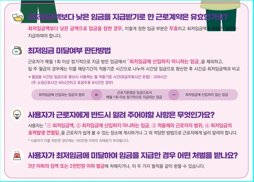 위반: 법정 최저임금 미달 → 사업주는 임금을 법정 기준 이상으로 조정해야 함.